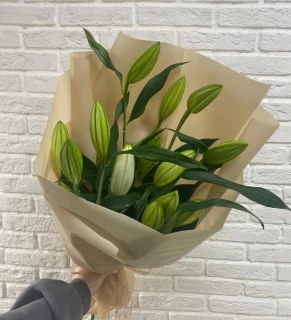 Великолепный букет из лилий в нежной упаковке, как настоящий символ изысканности и изящества. Каждый цветок, словно нота в нежной мелодии, раскрывает свою красоту и утонченность. Лилии, эти нежные цветы, приносят в дом атмосферу умиротворения и гармонии. Их аромат наполняет пространство нежностью и чистотой, словно лаская душу своей неповторимой магией. Упаковка букета, словно облачко из мягкого тюля, подчеркивает его изысканность и нежность, создавая вокруг цветов атмосферу загадочности и романтики.